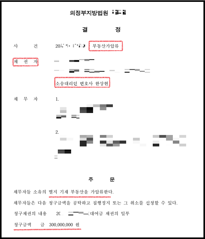 부동산가압류는 2-3주정도 소요됩니다. 먼저 법원에 부동산가압류신청서를 제출하고, 등록세, 등기촉탁비용 등을 납부하면 가압류판결이 나오게 됩니다. 아래 판결문은 저희가 부동산가압류를 한 사건입니다.