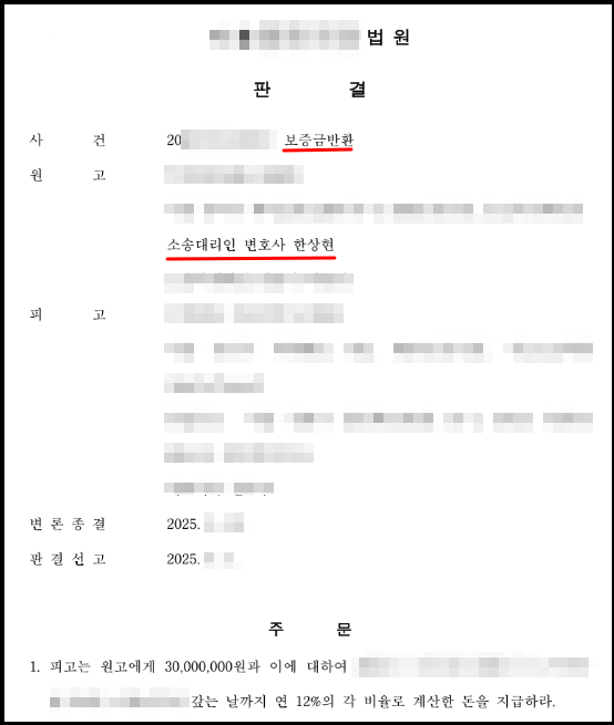 아래 판결문은 저희가 임대보증금반환소송에서 승소한 사건입니다.