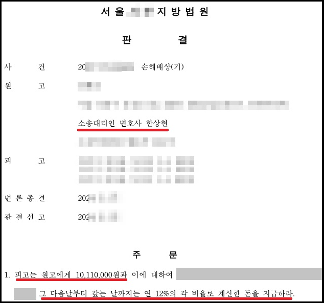 아래 판결문은 저희가 의뢰인을 위해 교통사고 과실소송을 제기해 승소한 사건입니다. 당초 보험사는 상당히 적은 돈의 합의금을 제시했었던 사건이었습니다.